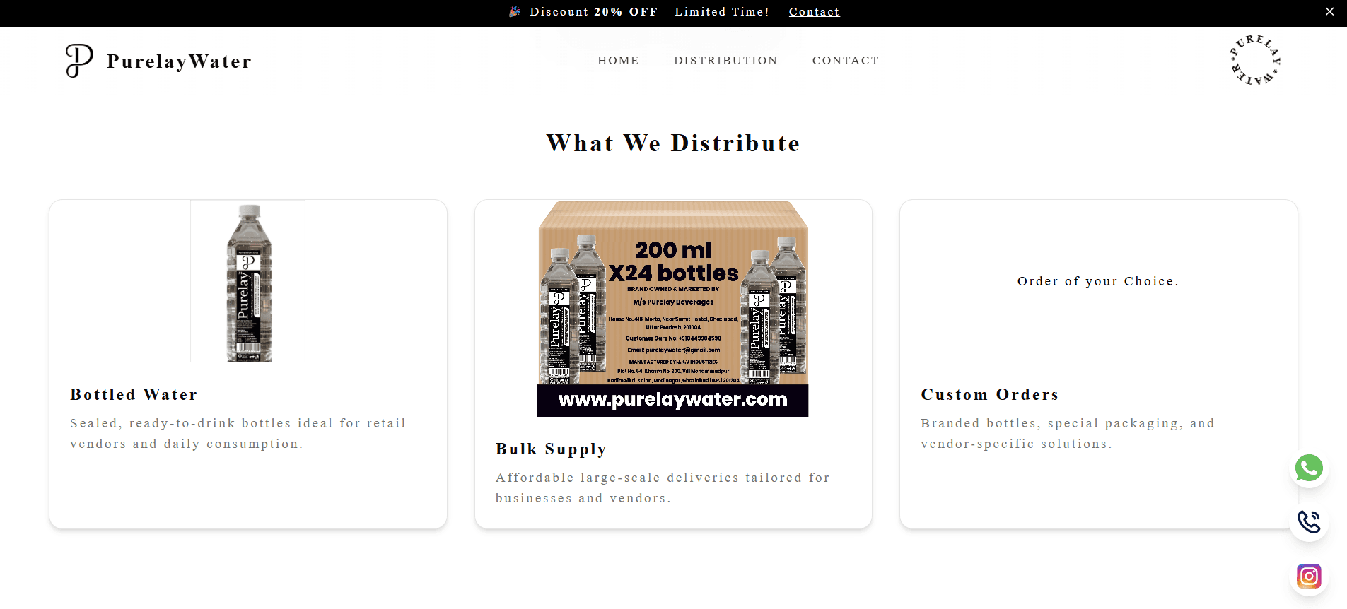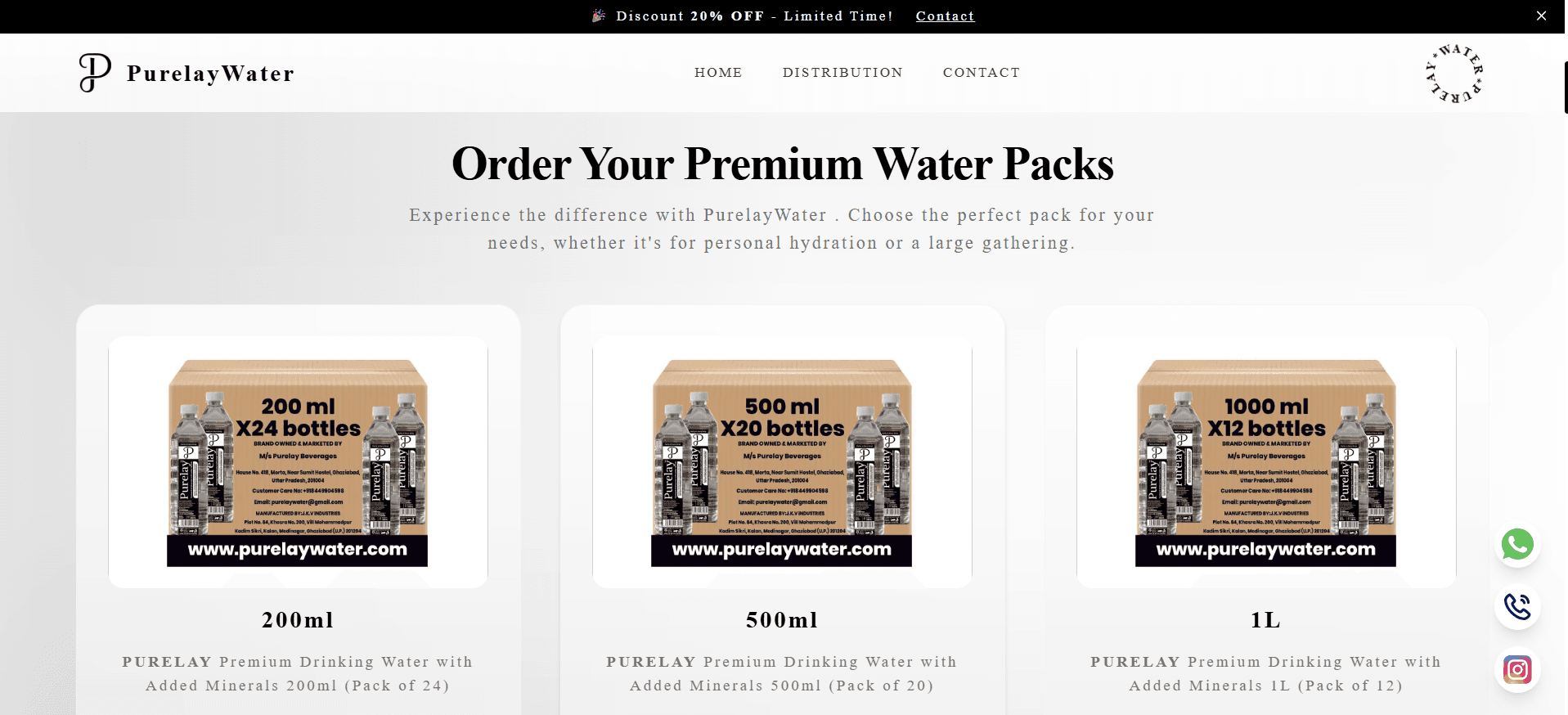 Purelay Water is a premium bottled water company committed to providing 100% pure and safe drinking water enriched with essential minerals. Sourced from natural springs and subjected to strict purification processes, each bottle ensures superior taste and hydration. Catering to homes, offices, events, and businesses, Purelay Water offers customizable branded bottles, bulk mineral water at affordable prices, and eco-friendly delivery solutions. With over 10,000 satisfied customers and 15+ years of experience, Purelay Water stands as a trusted name in the industry.